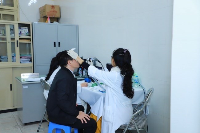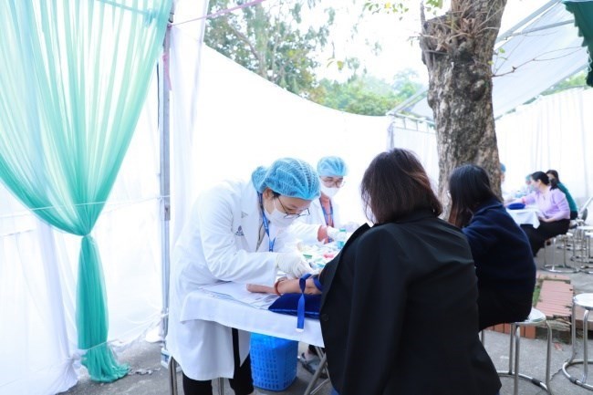 Các bác sĩ thực hiện đo huyết áp,lấy máu,khám tai - mũi - họng cho cán bộ, viên chức và người lao động