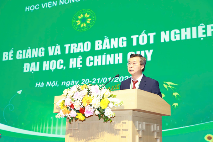 Phát biểu tại buổi lễ, PGS.TS. Nguyễn Công Tiệp - Ủy viên Ban Thường vụ Đảng ủy, Phó Giám đốc Học viện đã gửi tới các tân kỹ sư/tân cử nhân/tân bác sĩ thú y lời chúc mừng nồng nhiệt nhất. Thầy khẳng định: Tấm bằng hôm nay không chỉ là minh chứng cho năng lực, mà còn là biểu tượng của ý chí và nghị lực - của một thế hệ sẵn sàng gánh vác tương lai của dân tộc chúng ta. Thầy mong rằng, dù ở bất cứ đâu, làm bất kỳ công việc gì, các em vẫn luôn mang trong mình những nét văn hóa riêng có của sinh viên Học viện Nông nghiệp Việt Nam với một trái tim ấm áp, một tinh thần học hỏi không ngừng, một tâm hồn trong sáng và luôn có khát vọng cống hiến, dấn thân vì tương lai của dân tộc. Hãy xứng đáng là con cháu của Bà Triệu với khát vọng non sông: “Tôi muốn cưỡi cơn gió mạnh, đạp luồng sóng dữ, chém cá kình ở Biển Đông…”.