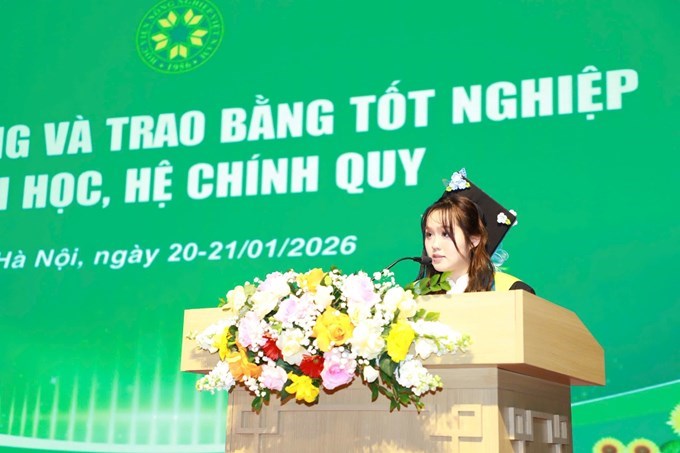 Thay mặt cho 938 sinh viên nhận bằng tốt nghiệp đợt này, em Cao Hải Yến - tân cử nhân nhận bằng tốt nghiệp loại xuất sắc ngành Kế toán đã bày tỏ lòng biết ơn sâu sắc tới Đảng ủy, Ban Giám đốc Học viện, các thầy giáo, cô giáo và cán bộ, viên chức đã tận tâm dìu dắt các em trong suốt những năm tháng học tập tại Học viện Nông nghiệp Việt Nam. Hải Yến khẳng định: Hành trình học tập bậc đại học không chỉ là quá trình tích lũy tri thức chuyên môn, mà còn là quãng thời gian trưởng thành về nhân cách, bản lĩnh và khát vọng cống hiến. Dưới mái trường Học viện, các em đã được học tập trong môi trường hiện đại, năng động, chuyên nghiệp, được tham gia nghiên cứu khoa học và các hoạt động cộng đồng - những hành trang quý báu để chúng em tự tin bước vào đời. Hải Yến bày tỏ quyết tâm sẽ tiếp tục học tập, rèn luyện, không ngừng đổi mới, giữ vững đạo đức nghề nghiệp và phát huy truyền thống của sinh viên Học viện, góp phần xây dựng đất nước và địa phương, xứng đáng với niềm tin yêu của Học viện, thầy, cô và xã hội.
