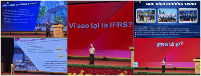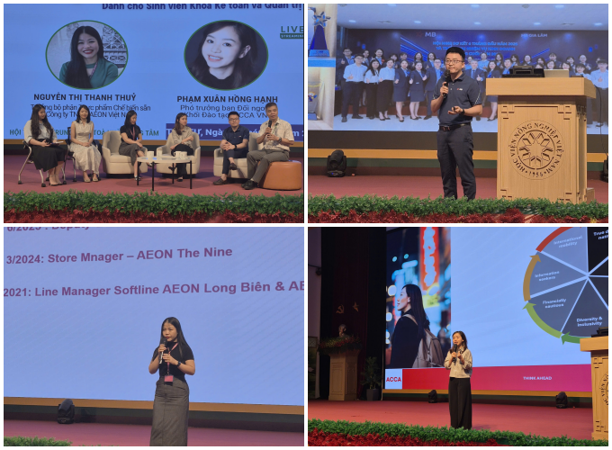 Từ phía doanh nghiệp, các diễn giả đến từ Công ty cổ phần quốc tế Long Hưng -chị Đặng Thị Kiều Anh, Giám đốc Công ty; Công ty TNHH Aeon Việt Nam - chị Nguyễn Thị Thanh Thuỷ, Trưởng bộ phận Thực phẩm chế biến sẵn; Ngân hàng MB bank – anh Trần Ngọc Vinh, Phó giám đốc khối KHCN, chi nhánh Gia Lâm, đã có bài trình bày riêng theo từng chủ đề lĩnh vực hoạt động của doanh nghiệp cũng như về cơ hội tuyển dụng và ưu đãi dành riêng cho sinh viên các ngành thuộc Khoa Kế toán và Quản trị kinh doanh nói chung và sinh viên các ngành Kế toán, Quản trị kinh doanh và Thương mại điện tử nói riêng.