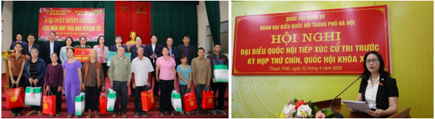 | Đại biểu Nguyễn Thị Lan thông báo kết quả trả lời về những kiến nghị của cử tri tại Thạch Thất và trao tặng quà tại Chương Mỹ (cũ) thành phố Hà Nội |