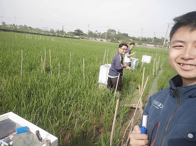 | Sinh viên thu khí CH4 phát thải trên ruộng lúa |